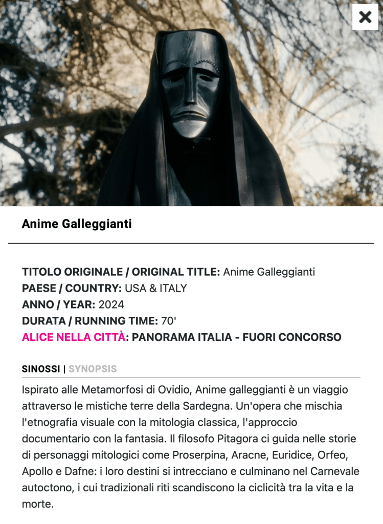 Inspired by Ovid’s Metamorphoses, Wandering Souls is a journey through the mystical land of Sardinia. This hybrid film mixes visual and musical ethnography with classical mythology, documentary methods with fantasy. The intertwined destinies of Ovid’s characters culminate during the autochthonous carnival, whose rites mark the cyclical nature of life and death.