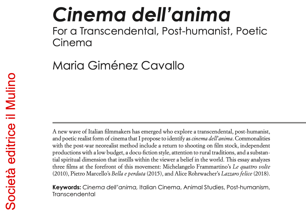 In this podcast we discuss Maria Giménez Cavallo’s concept of ‘cinema dell’anima’, (Cinema of the Soul), an idea triggered by three Italian films from the last two decades. Maria’s concept has three elements and she highlights a film for each: transcendental – ‘ Le Quattro Volte’ (2010) directed by Michelangelo Frammartino; posthumanism – ‘Bella e Perduta’ (2015) directed by Pietro Marcello; poetic realism – ‘Lazzaro Felice’ (2018) directed by Alice Rohrwacher. Maria outlines the story of each film and the aspects that support her thesis and we go on to discuss other films that can be categorised in this way and writers who have influenced Maria’s thinking, including Paul Schrader’s book ‘Transcendental style in film’ and Gilles Deleuze’s Cinema 2, and other directors. Maria also speaks about having worked with Marcello and Rohrwacher on their recent documentary ‘Futura’ and how filming in Sardinia led to her own first feature ‘Anime Galleggianti’ (Wandering Souls) a reimagining of Ovid’s ‘Metamorphoses’, and she also talks about her upcoming film.