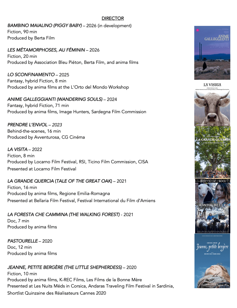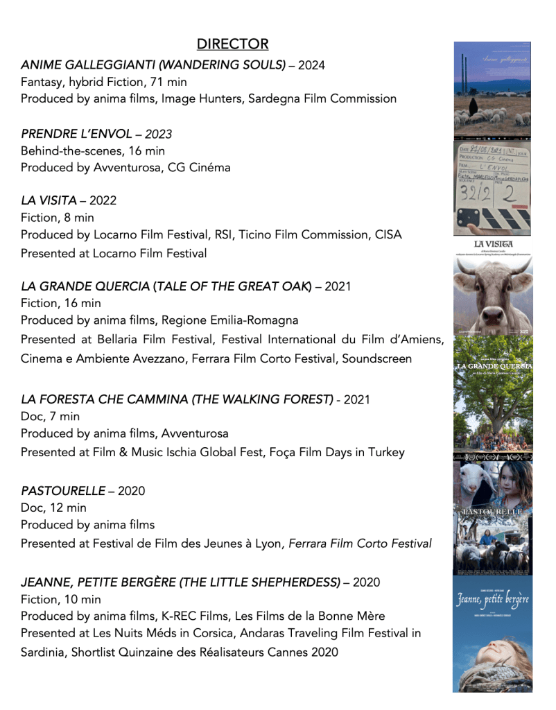 In 2020, Maria opened anima films with Jo Ann Cavallo in order to produce her own work. Since then, she has made various short films with nature as the central theme, including La Visita (Locarno 2022), La Grande Quercia (Bellaria, FIFAM 2022), and Jeanne, petite bergère (Shortlist Quinzaine 2020).