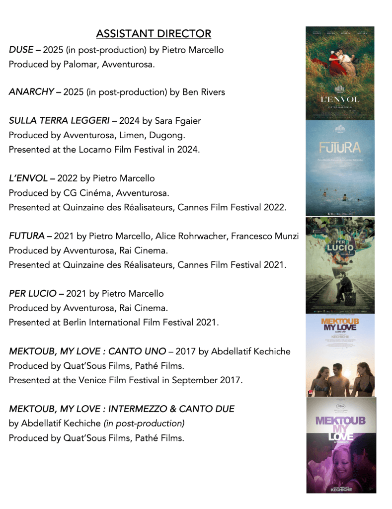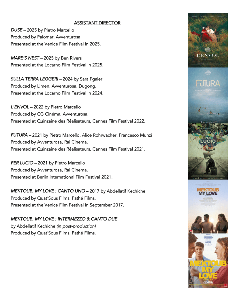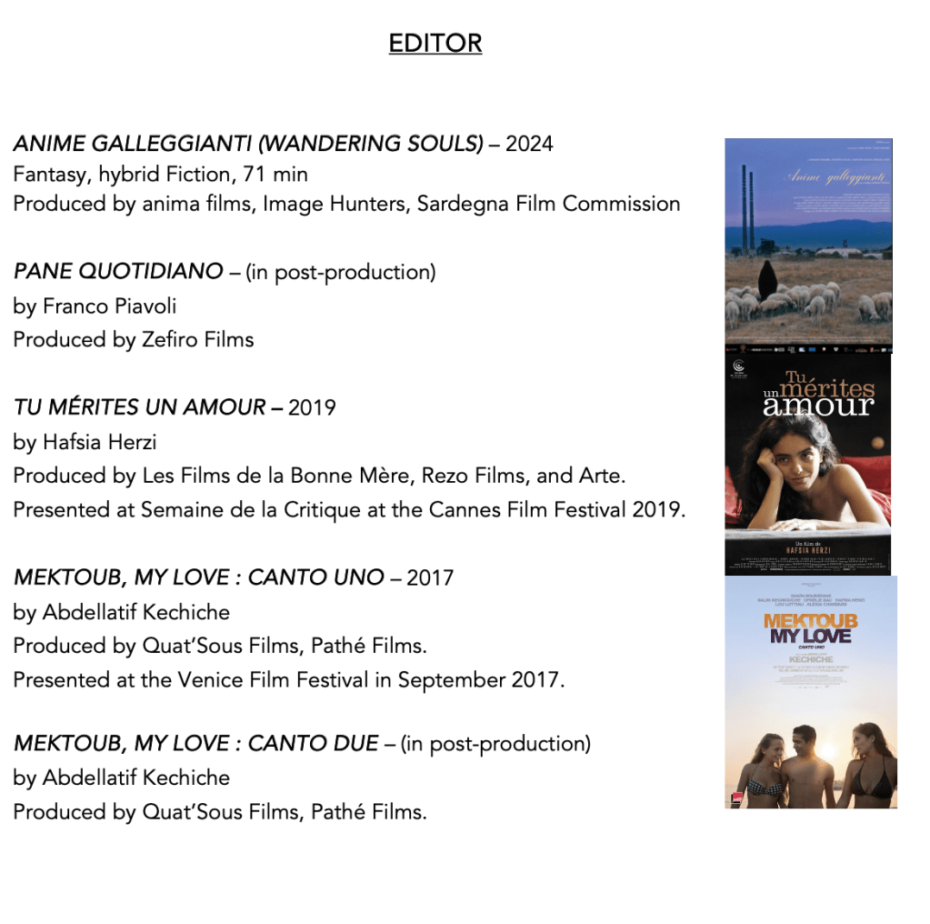 She also co-edited Hafsia Herzi’s film feature film Tu mérites un amour, was an assistant director on Sara Fgaier’s Sulla Terra Leggeri (Locarno Competition 2024) and recently Ben Rivers’ Anarchy (in post-production).